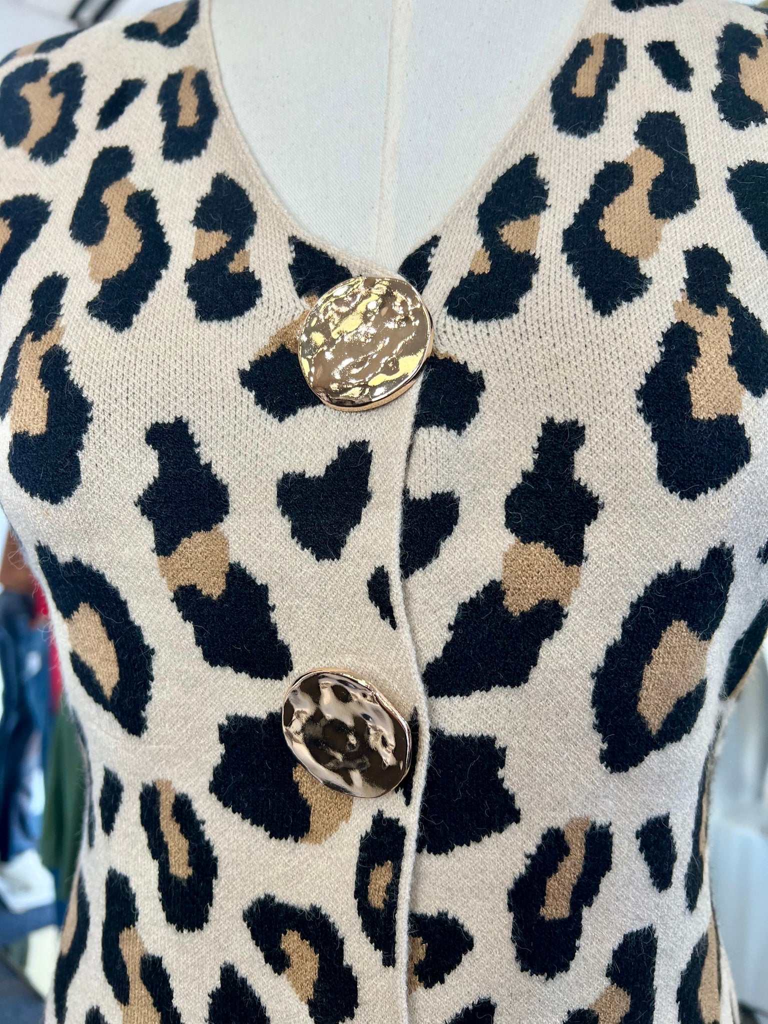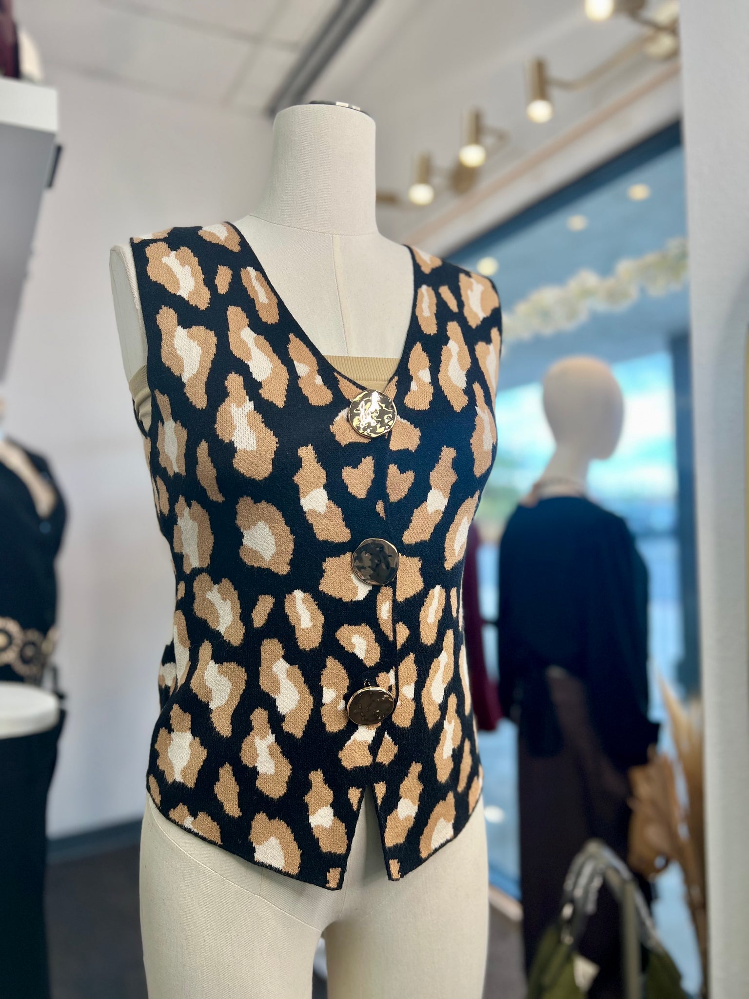 Elevate your wardrobe with the Melanie Animal Print Stretchy Knit Vest. Crafted from soft, stretchy material, it offers a flattering fit that moves with you. The sophisticated animal print design adds a bold yet elegant touch, while gold button details provide a refined accent. Perfect for layering, this vest combines comfort and chic style effortlessly.