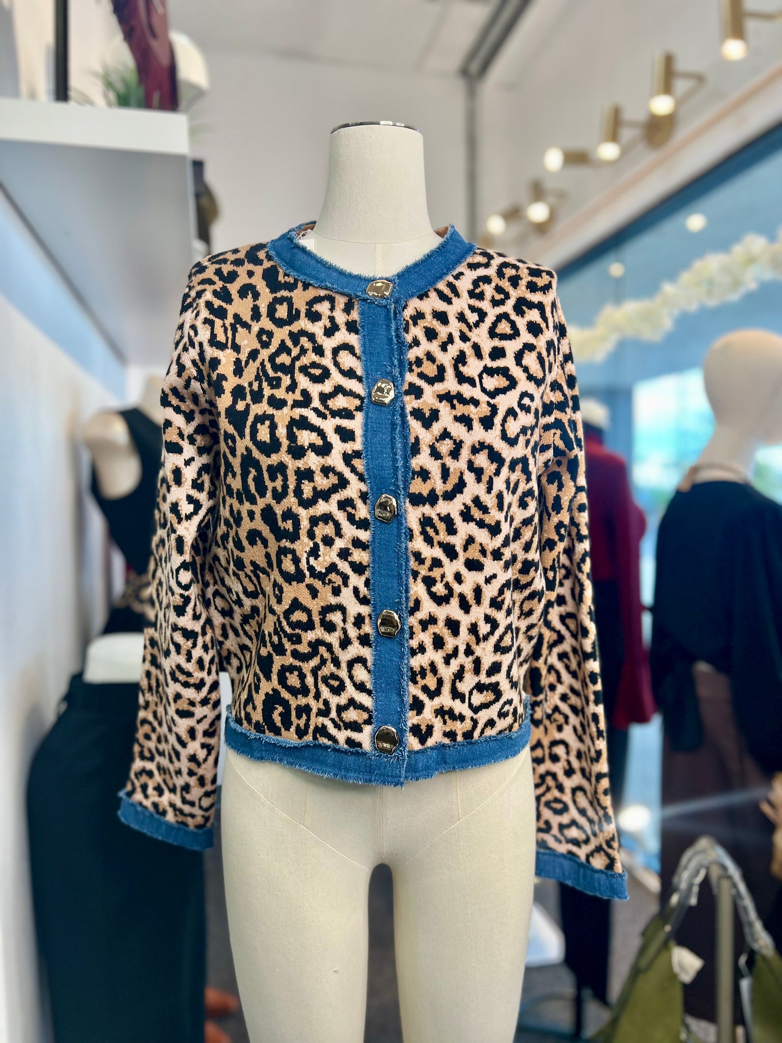 Bring a wild twist to your wardrobe with the Camila Animal Print Distressed Denim Trimming Button Up Sweater. Featuring playful animal print fabric, edgy distressed details, and shiny gold buttons, this sweater adds personality to any outfit. The denim trimming delivers a cool, casual vibe, making it perfect for layering and adding fun flair to your everyday look.