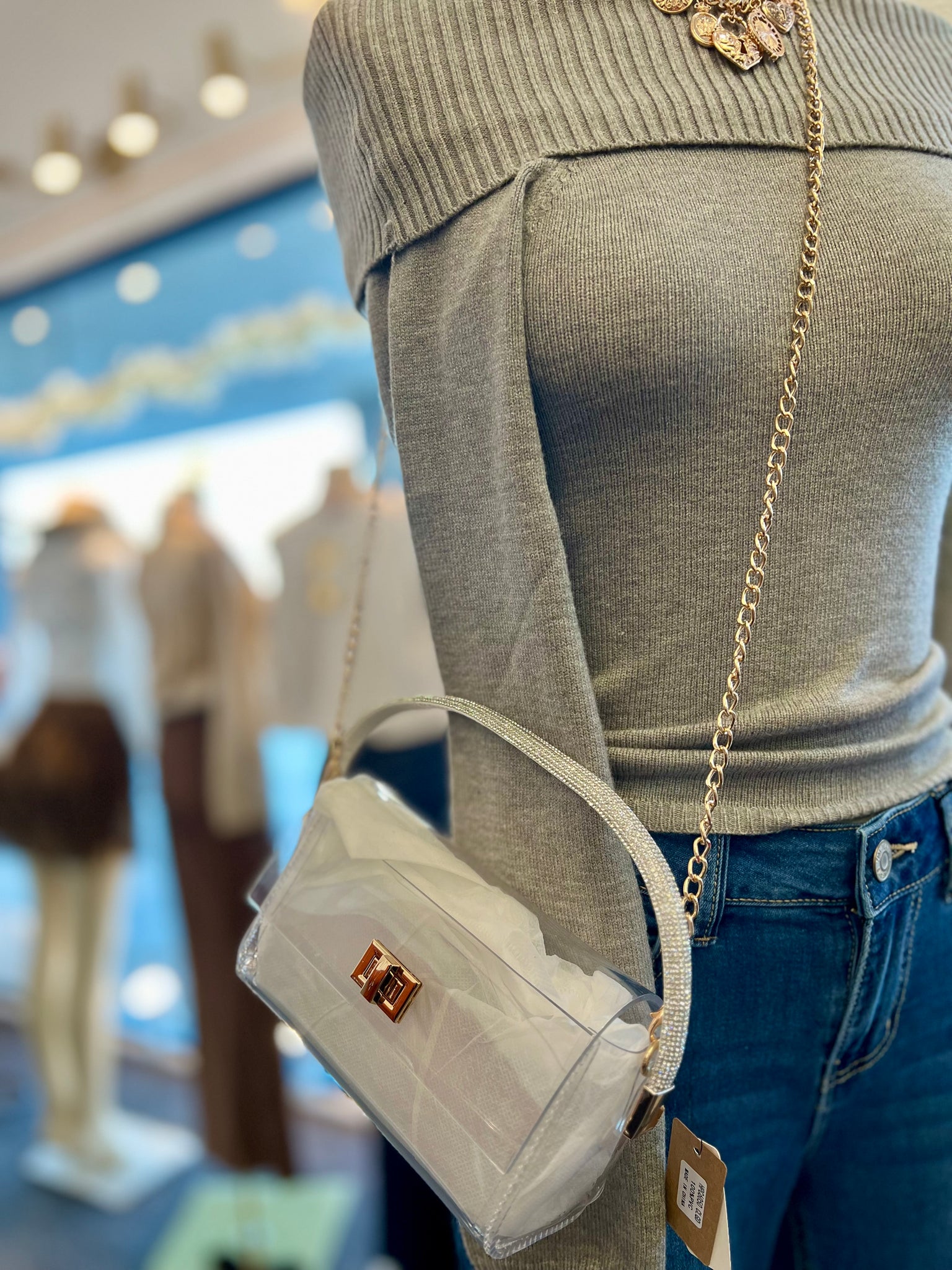 Add a sparkling touch to your outfit with the Rachell Clear Clutch Handbag. Featuring a chic gold closure and a faux Swarovski handle, this playful accessory combines elegance and fun. The gold strap lets you wear it hands-free, making it perfect for parties or nights out when you want to shine bright and keep your essentials close.