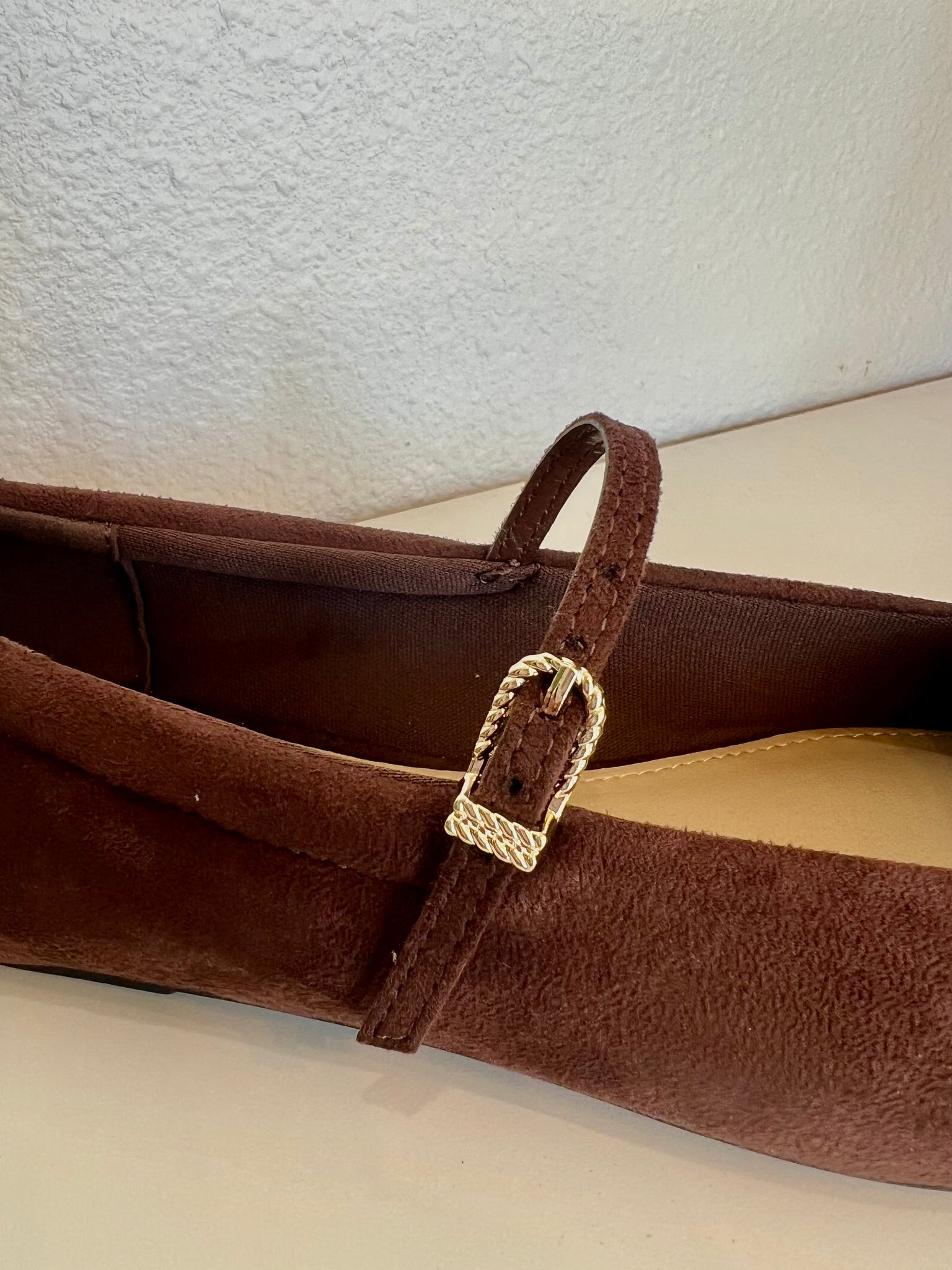 Elevate your fall wardrobe with these Mary Jane Brown Suede Flats, featuring elegant gold detailing that adds a refined touch. Crafted from soft suede, they offer a luxurious feel while the timeless ballet style ensures effortless sophistication. Perfect for cooler seasons, these flats combine comfort and classic charm for versatile everyday wear.