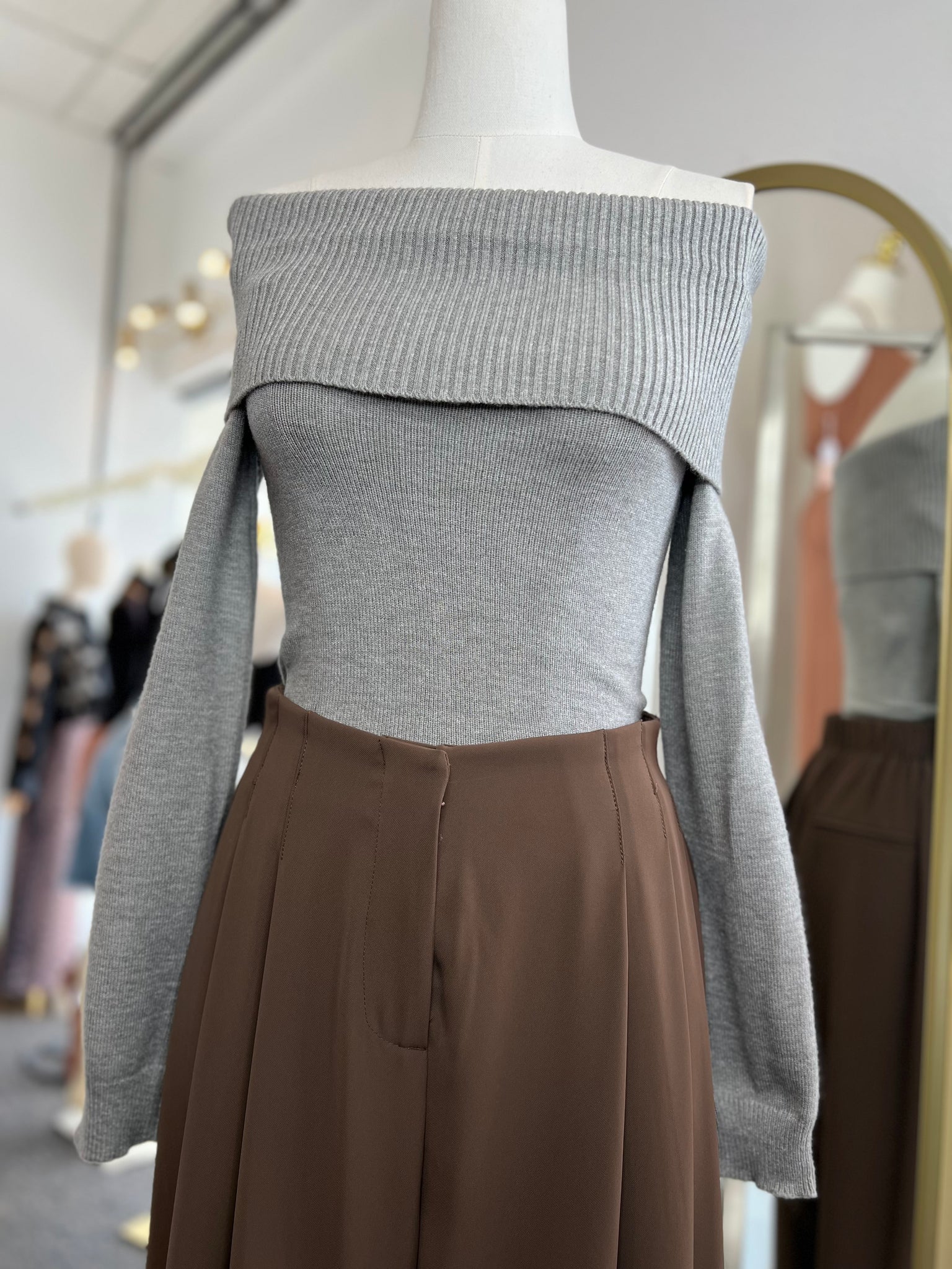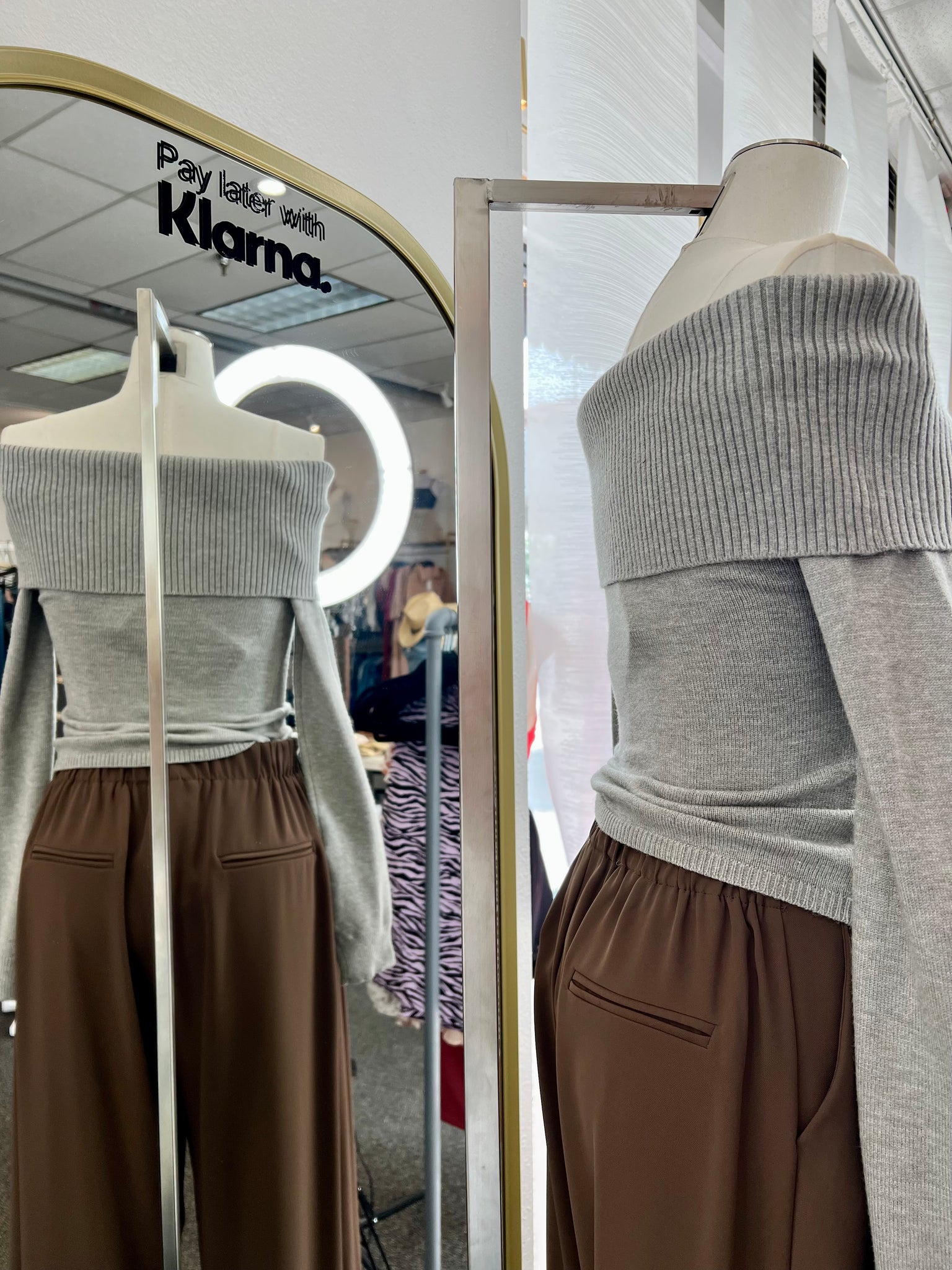 Stay cozy and stylish in the Elena Knit Off-The-Shoulder Long Sleeve top. Crafted from soft, stretchy heather grey knit fabric, this cute piece offers a comfortable fit that moves with you. Its off-the-shoulder design adds a flirty touch, perfect for dressing up or down. Whether layered or worn alone, it’s an effortlessly charming addition to your wardrobe.
