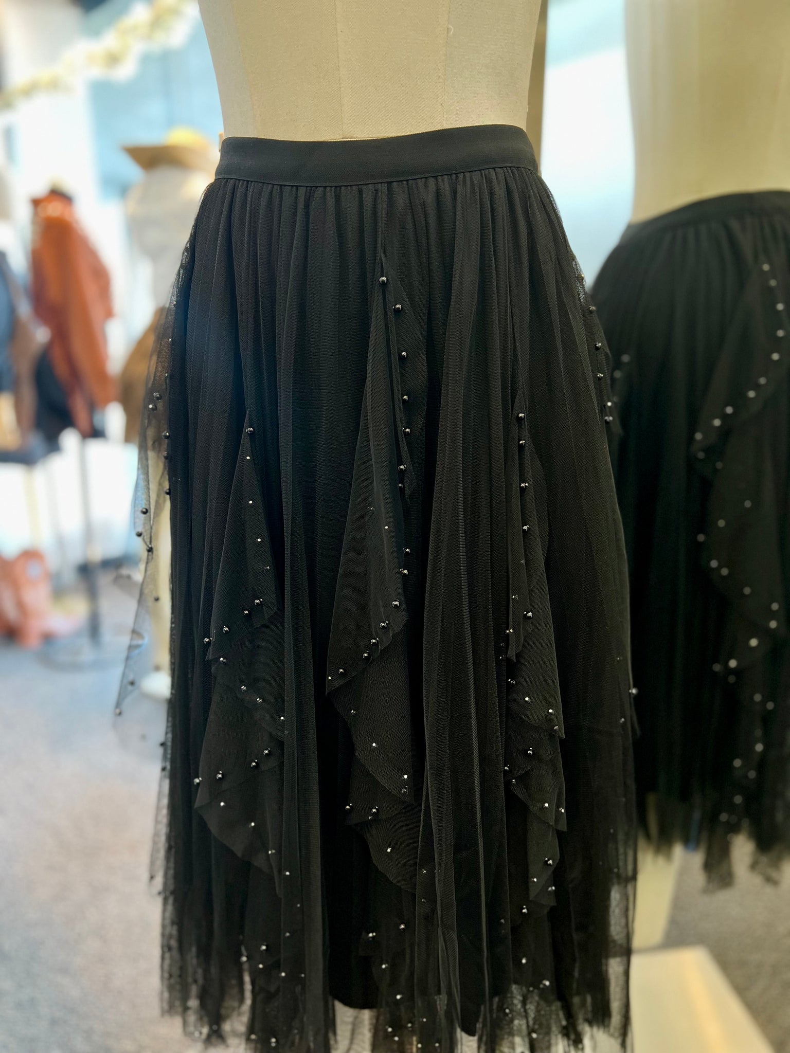 Elevate your ensemble with the Lizz Embellished Mesh Panel Midi-Skirt. This black skirt features a delicate mesh panel adorned with faux black pearls, adding refined texture and subtle glamour. Its midi length offers versatile elegance, perfect for sophisticated occasions or polished everyday wear. Designed to make a statement while maintaining timeless appeal, this skirt is a stylish addition to any wardrobe.