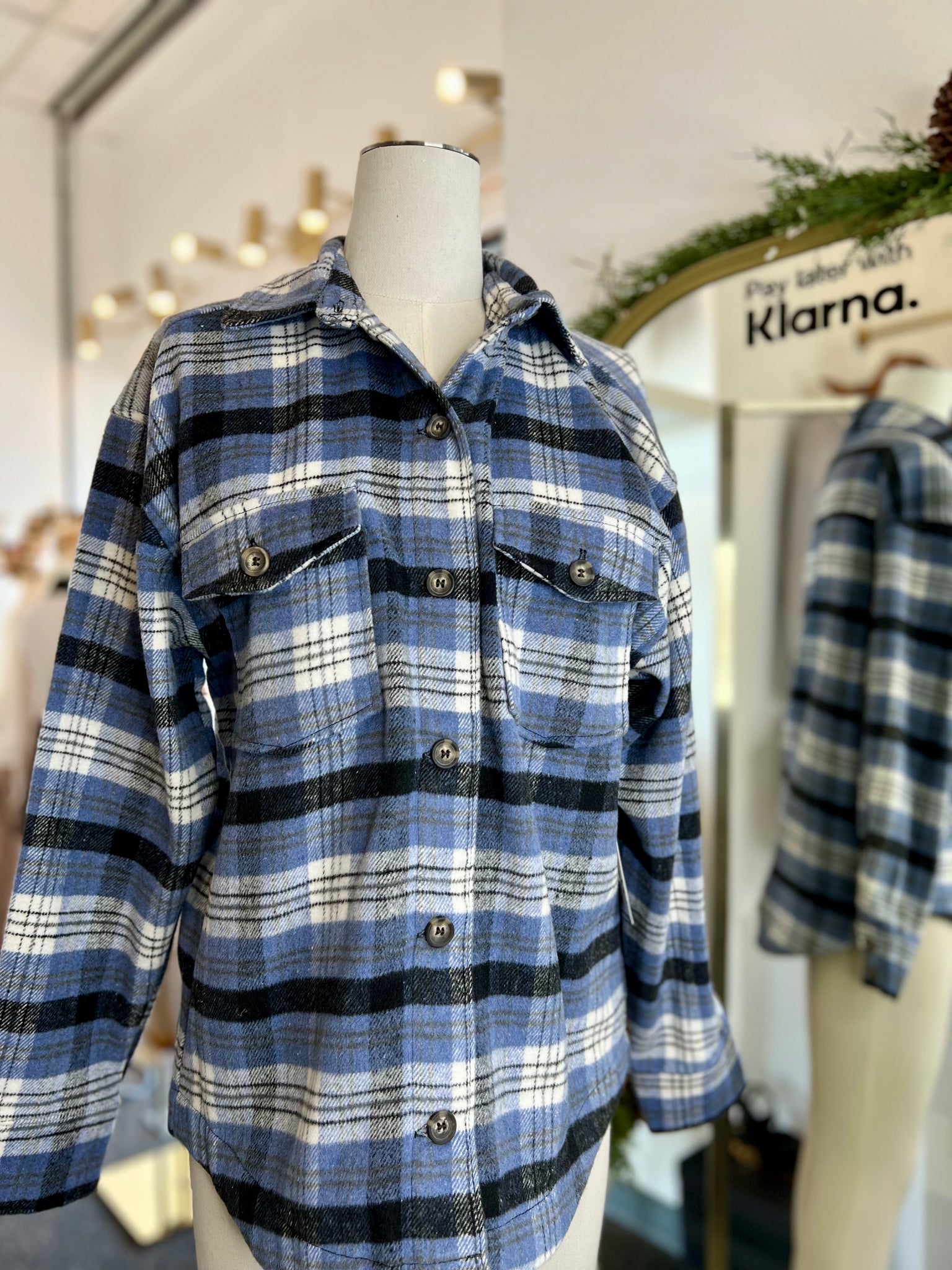 Introducing the Nathalie Plaid Shacket in Blue – your new favorite layering piece! This cozy button-up combines the best of both worlds with a classic plaid design that's perfect for any season. The warm blue tones make it ideal for throwing over your favorite tee or dress, whether you're heading out for coffee or a casual weekend adventure. Soft, stylish, and endlessly versatile, this shacket is ready to become your go-to jacket. Layer it, love it, live in it!