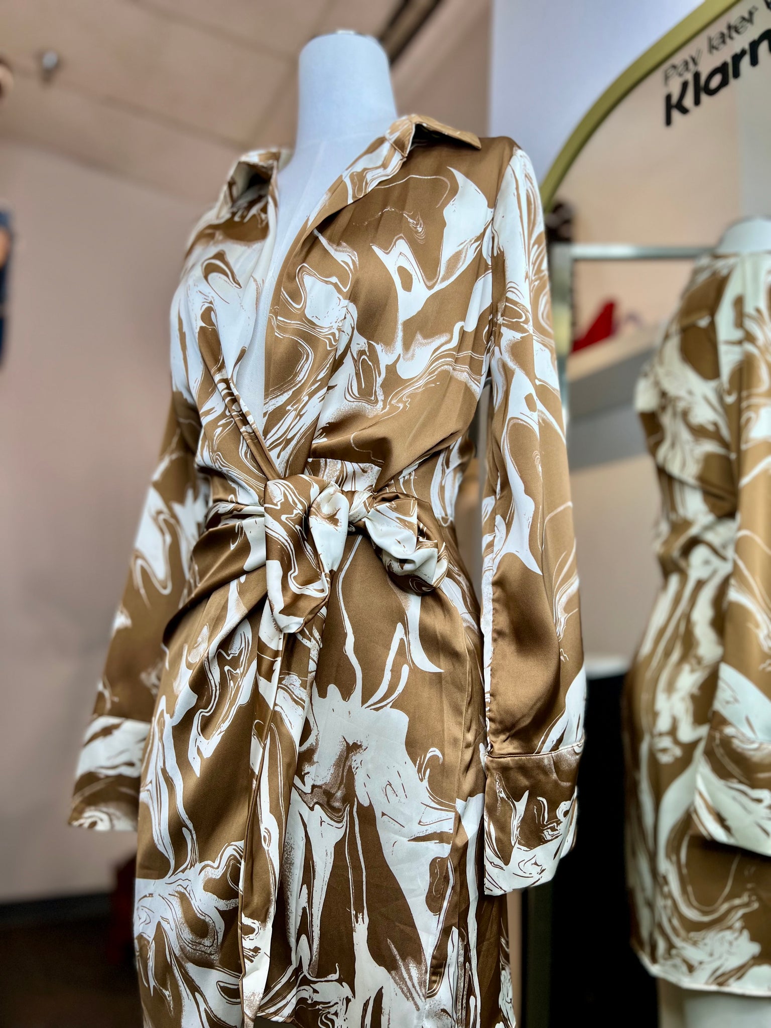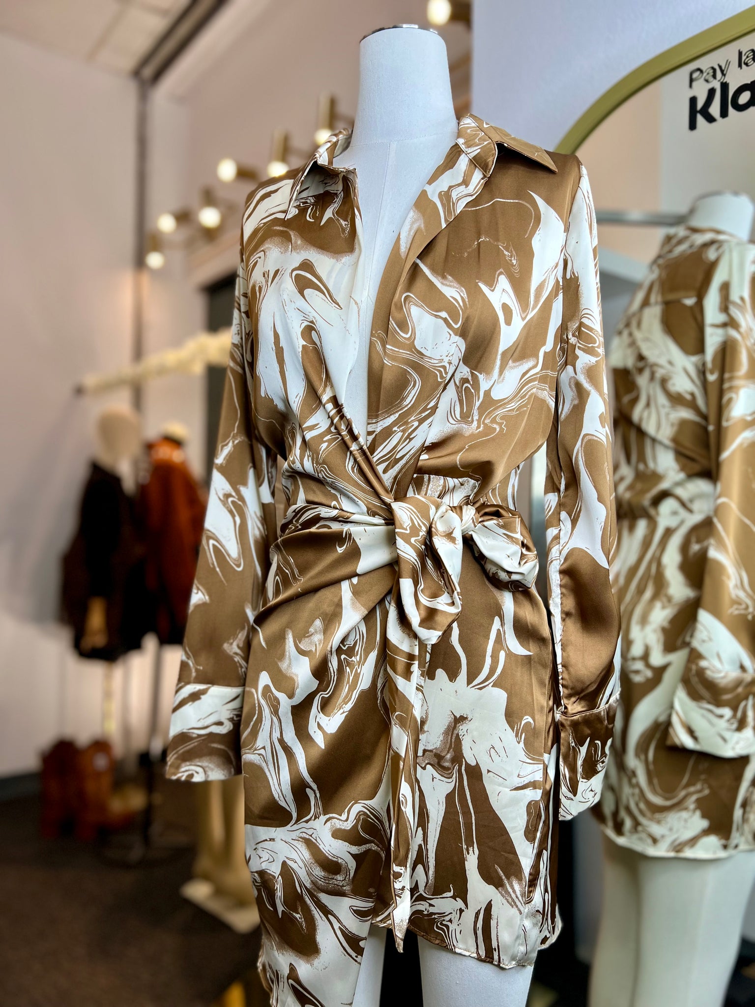 Elevate your elegance with the Carol Satin Mini Dress, featuring a delicate light coffee marble pattern that adds subtle sophistication. This long-sleeve dress boasts a flattering V-neckline and a front tie detail, creating a refined silhouette perfect for both day and night occasions. The smooth satin fabric offers a graceful drape that enhances your natural poise with every movement.