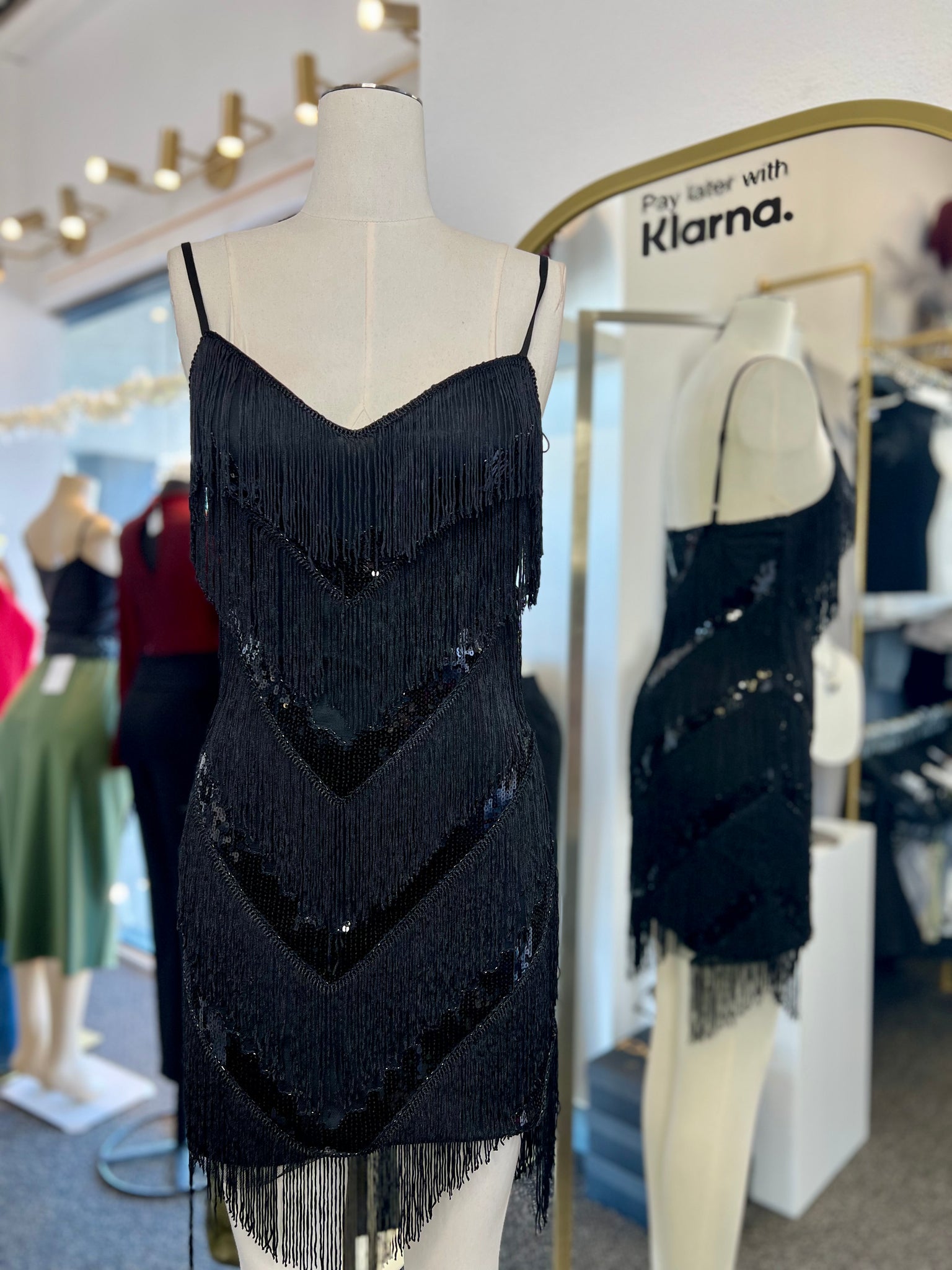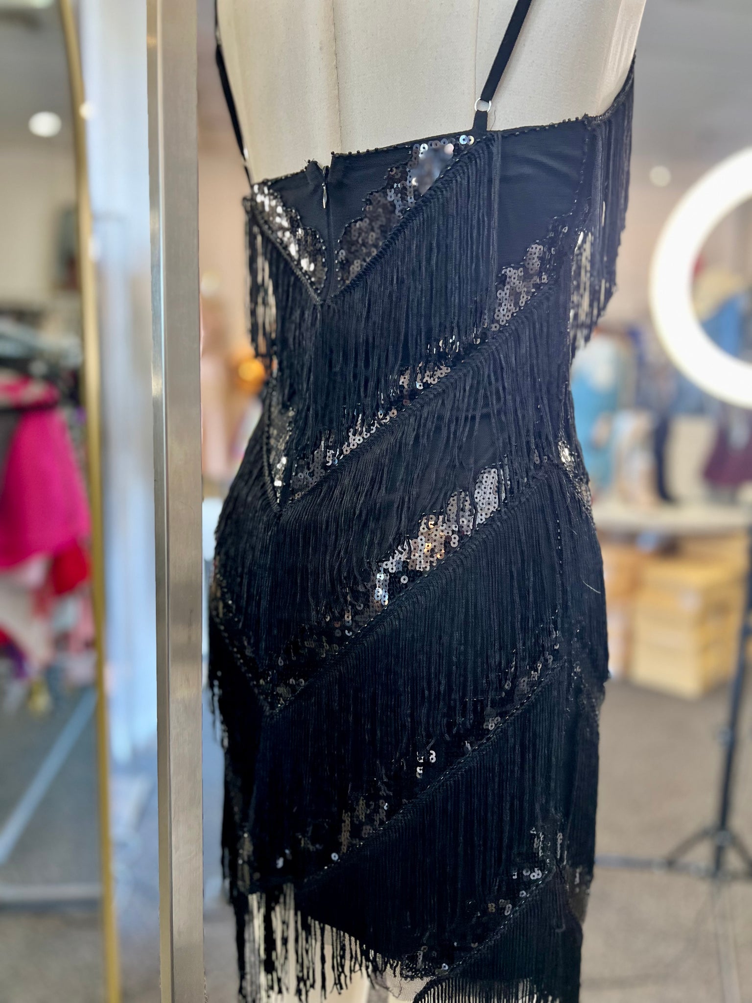 Charlene Black Adjustable Spaghetti Strap Fringes Dress