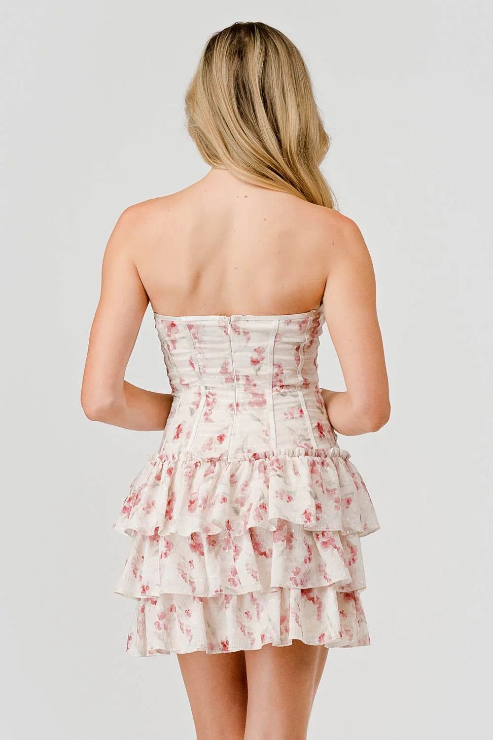 Get ready to turn heads in the Yessenia White/Pink Floral Midi Dress. With a playful strapless design and hidden back zipper, this dress is both comfortable and stylish. The padded bra provides support while the floral detail and ruffles add a touch of femininity. Perfect for any occasion.