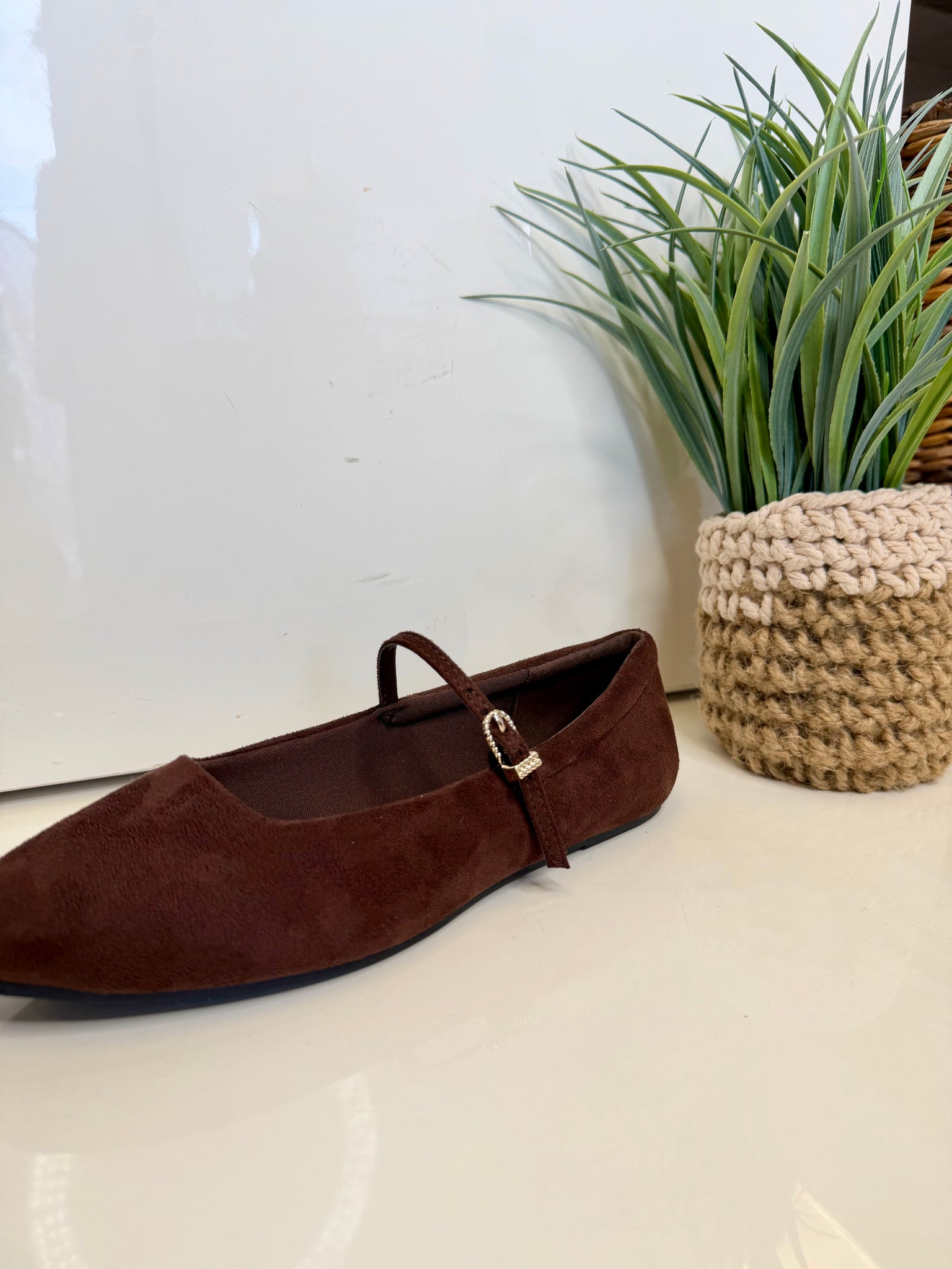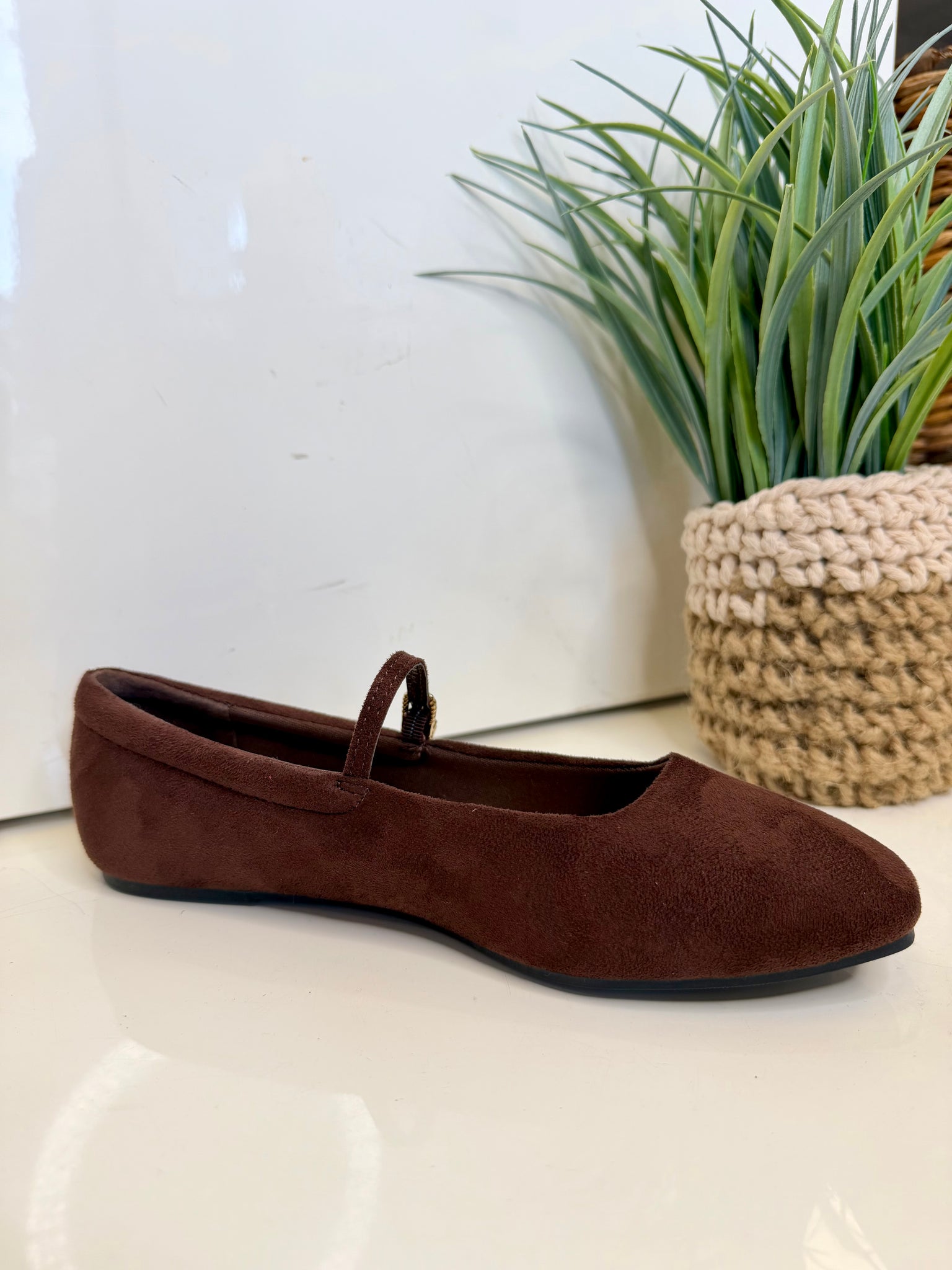 Elevate your fall wardrobe with these Mary Jane Brown Suede Flats, featuring elegant gold detailing that adds a refined touch. Crafted from soft suede, they offer a luxurious feel while the timeless ballet style ensures effortless sophistication. Perfect for cooler seasons, these flats combine comfort and classic charm for versatile everyday wear.