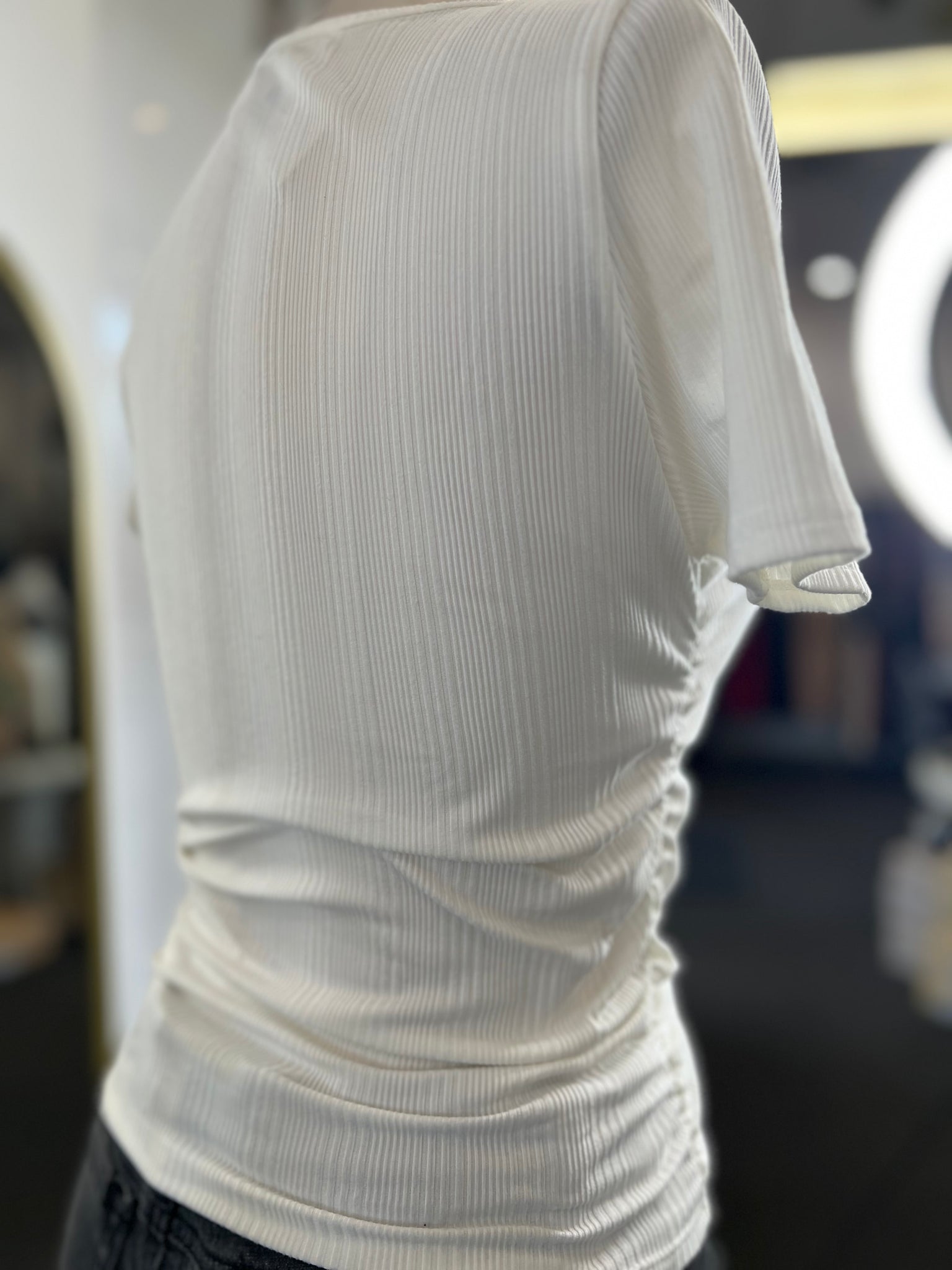 This white ribbed top is your new everyday favorite! Its comfy, breathable fabric keeps you cool, while the playful cinched sides add a fun twist to a classic round neckline. Perfect for effortless style with a touch of charm.