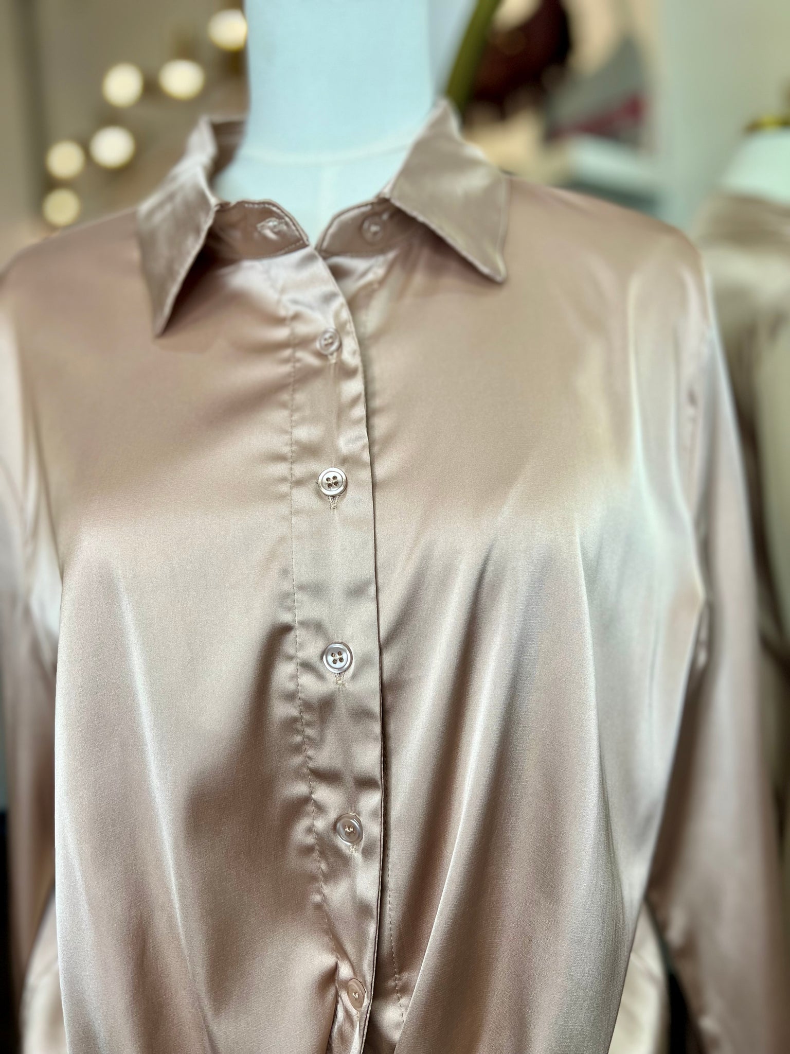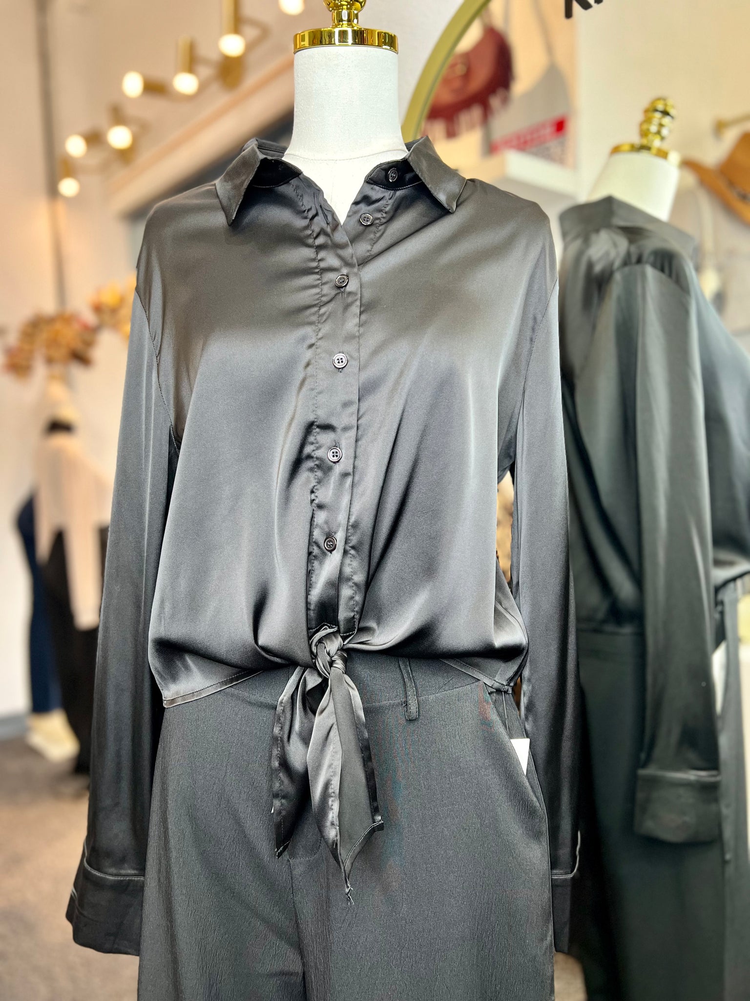 Elevate your wardrobe with this refined satin blouse, available in timeless khaki or classic black. Featuring a flattering tie-front design that adds dimension and movement, paired with buttoned cuffs for polished sophistication. The luxurious satin fabric drapes beautifully while maintaining structure, making it equally suited for professional settings or elevated casual occasions. A versatile essential that transitions seamlessly from day to evening.