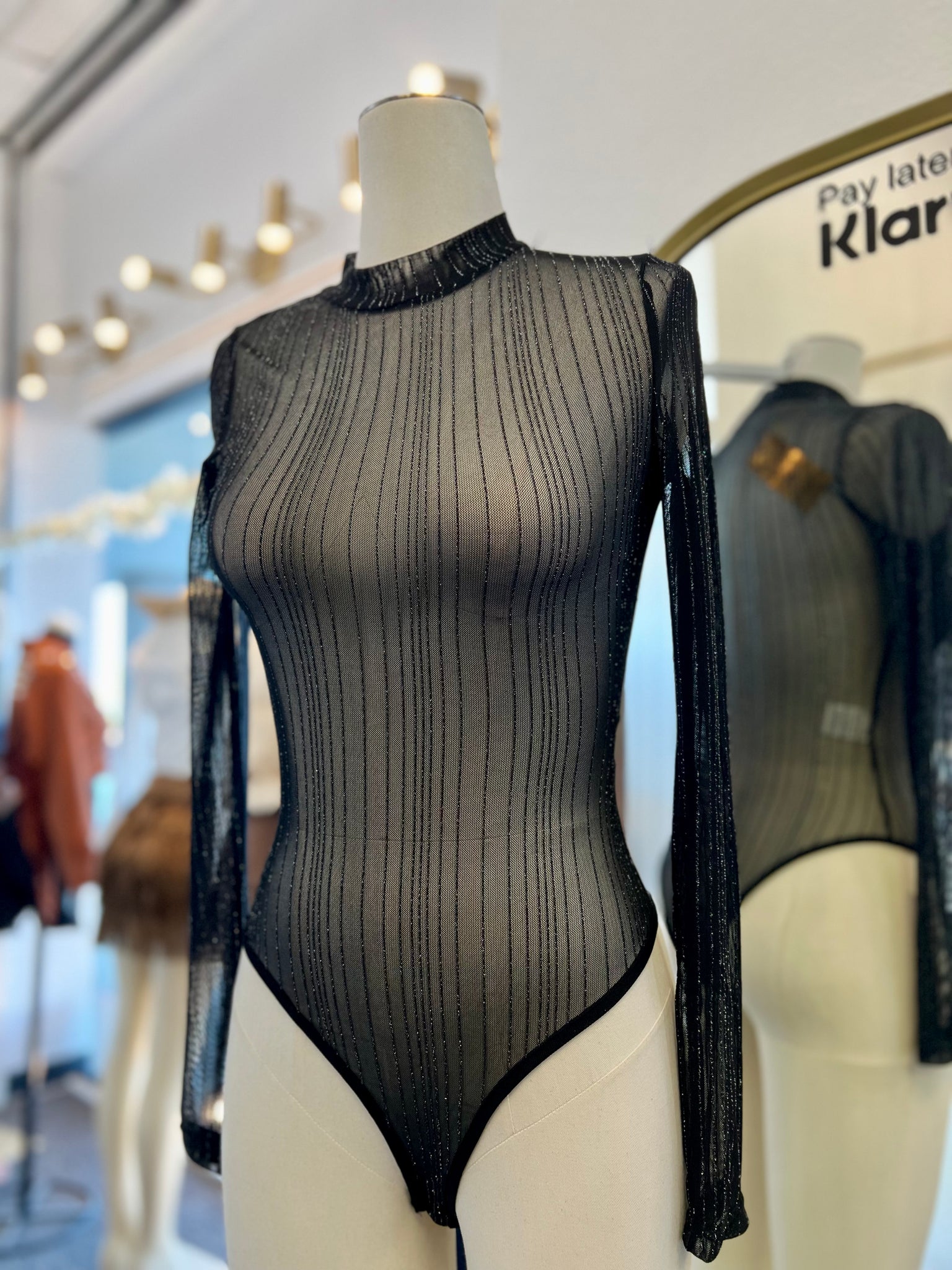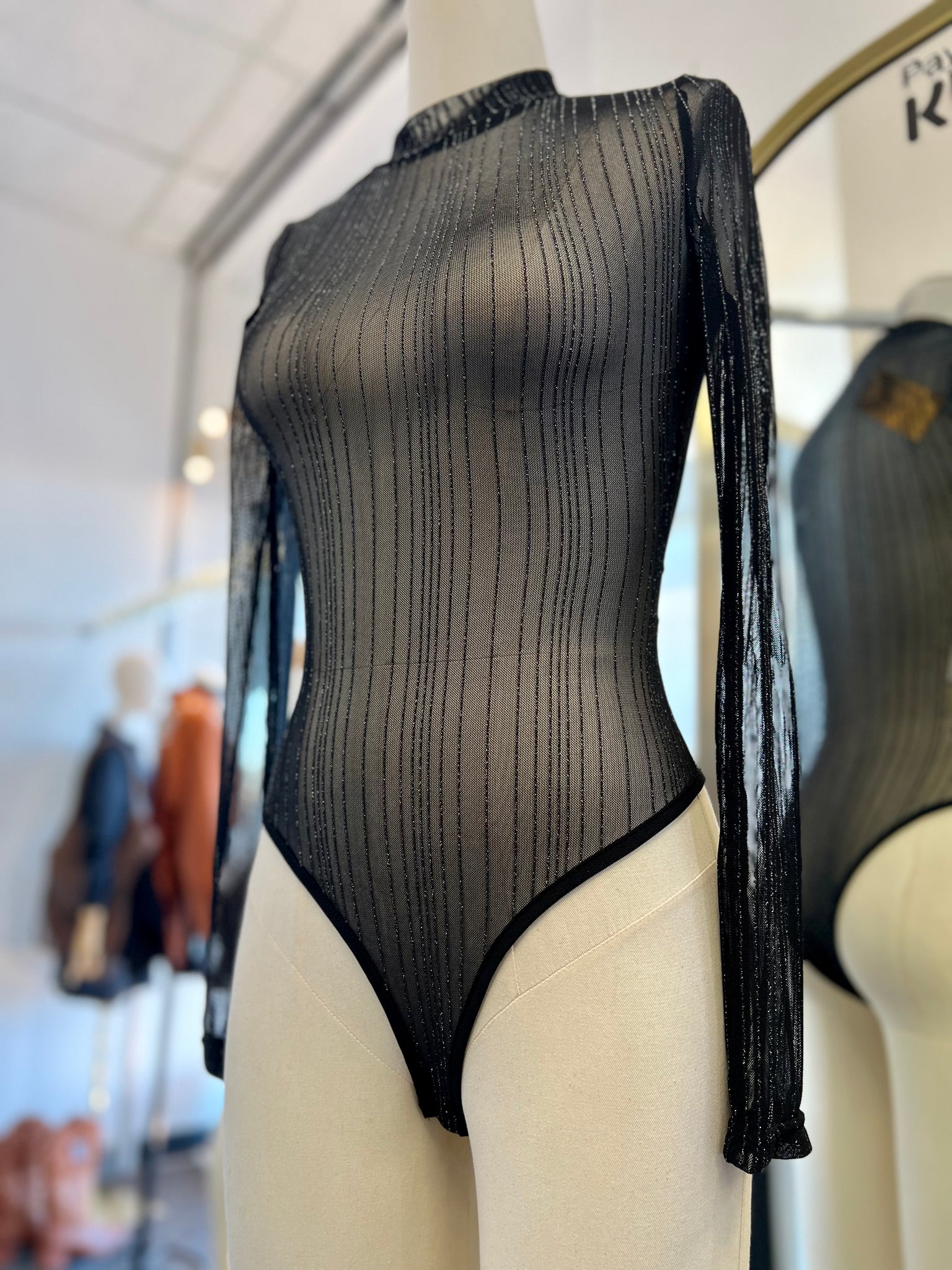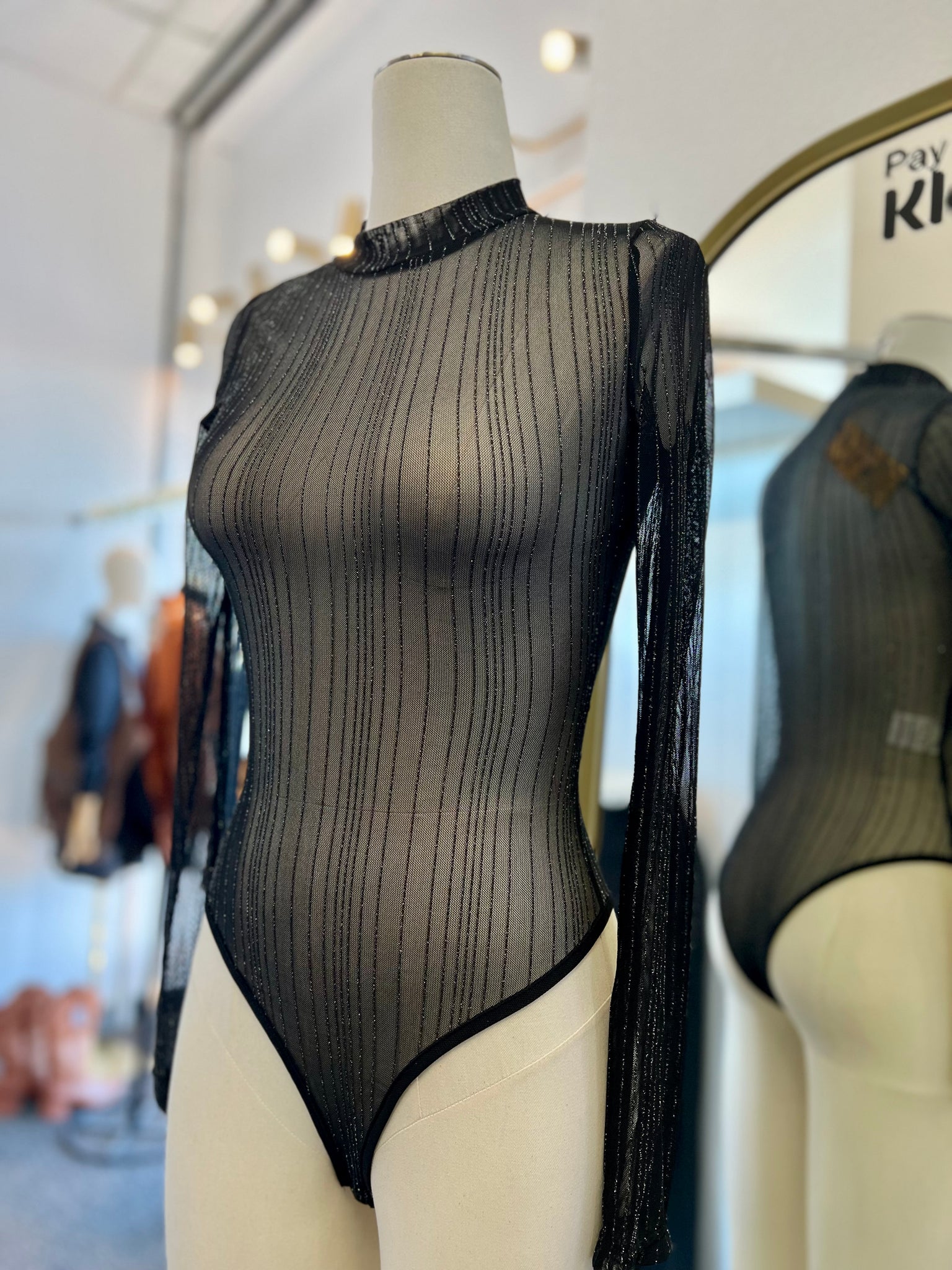 Elevate your wardrobe with the Hannia Black Bodysuit. Crafted from transparent material, it offers a sleek, alluring silhouette while maintaining an elegant edge. The button detail adds a refined touch, ensuring both style and ease. This bodysuit blends modern design with timeless appeal, perfect for sophisticated layering or standout looks.