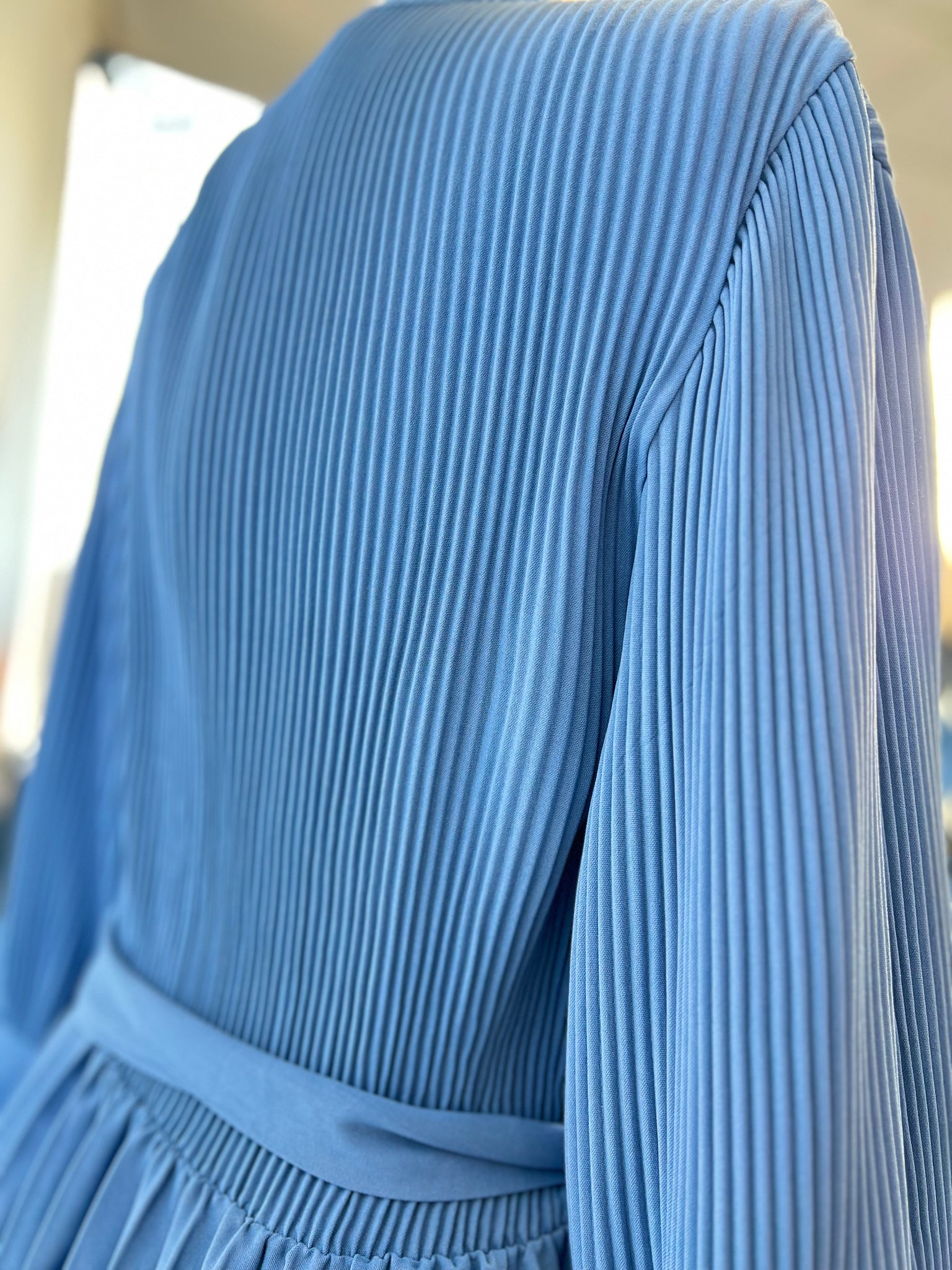 Elevate your wardrobe with this sophisticated maxi pleated dress, available in classic black or rich blue. Featuring elegant 3/4 sleeves and a flattering V-neck design, this dress creates a refined silhouette. The thoughtful tie-waist detail accentuates your figure while providing adjustable comfort for all-day wear.